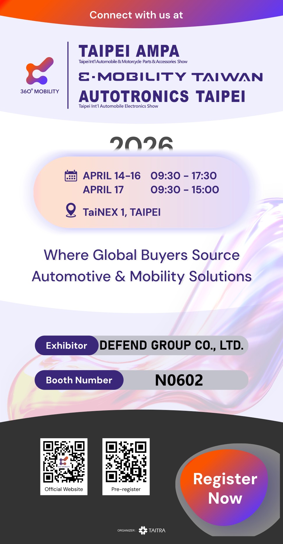 → AMPA Show Date and Time April. 14-16 9:30 a.m. - 5:30 p.m. April. 17 9:30 a.m. - 3:00 p.m. → Exhibition Venue Nangang Exhibition Center, Hall 1 (TaiNEX 1) → Booth Number DEFEND GROUP CO., LTD. → N0602 (4F)