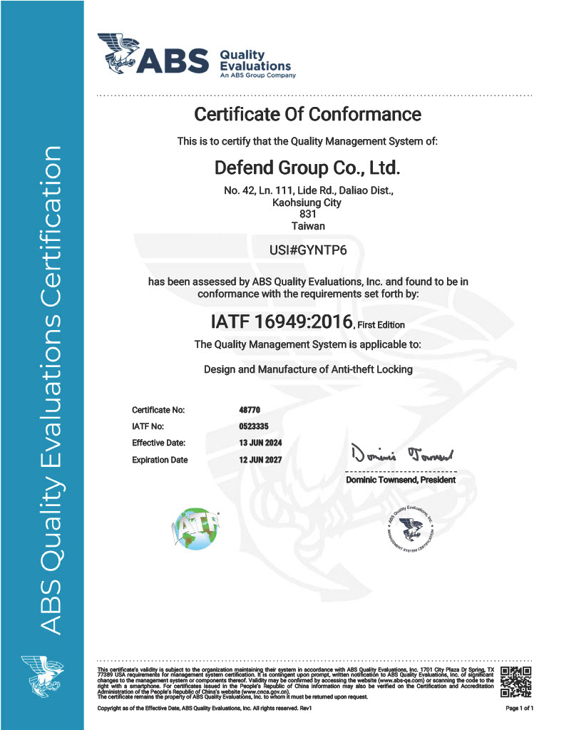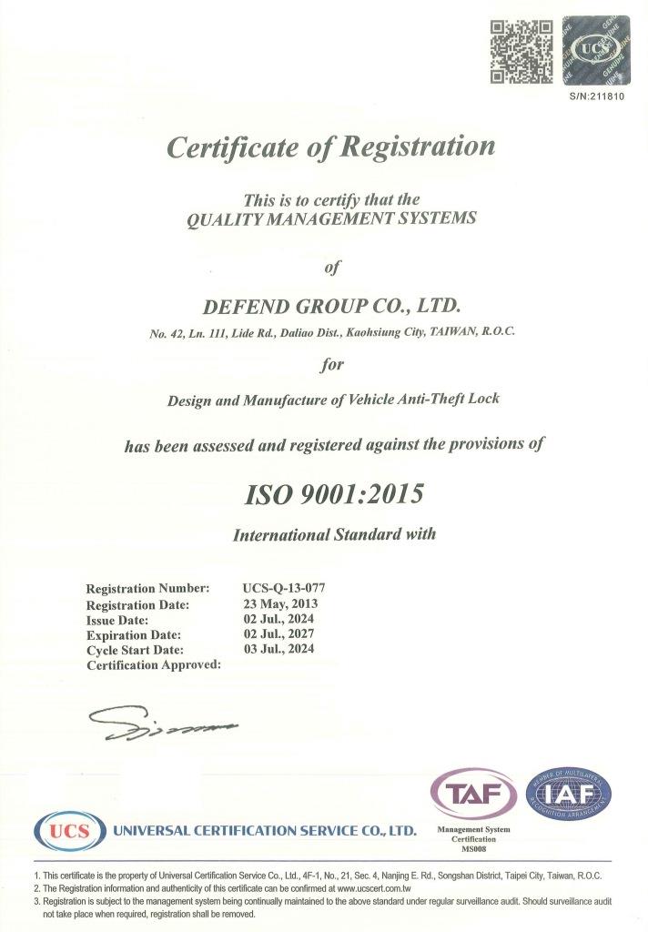 Not only do we focus on producing high-quality products, but DEFEND GROUP also places great importance on quality assurance and after-sales service in our company management. With the cooperation of our employees, we obtained ISO 9001:2015 certification in 2018. We are dedicated to enhancing our market leadership and image through continued development and design, with the aim of providing the best service and safest anti-theft products to our customers.