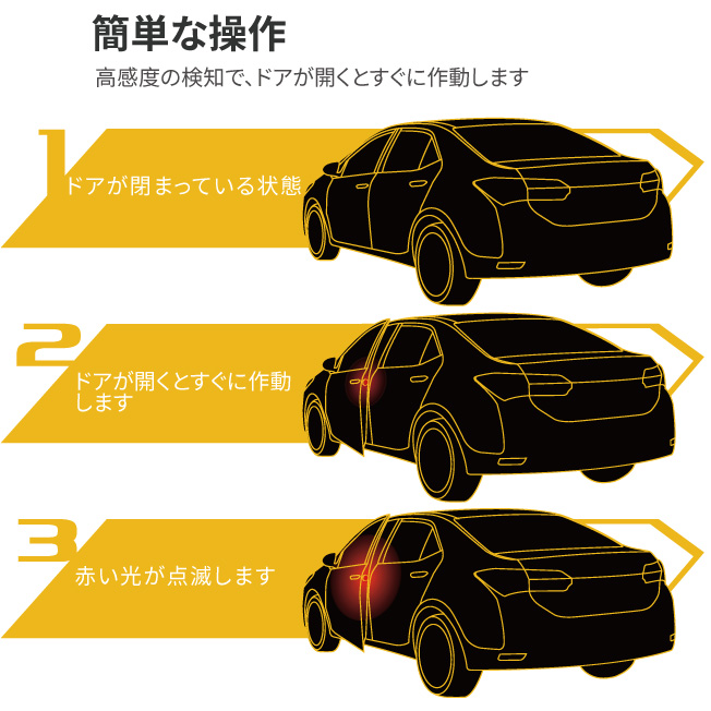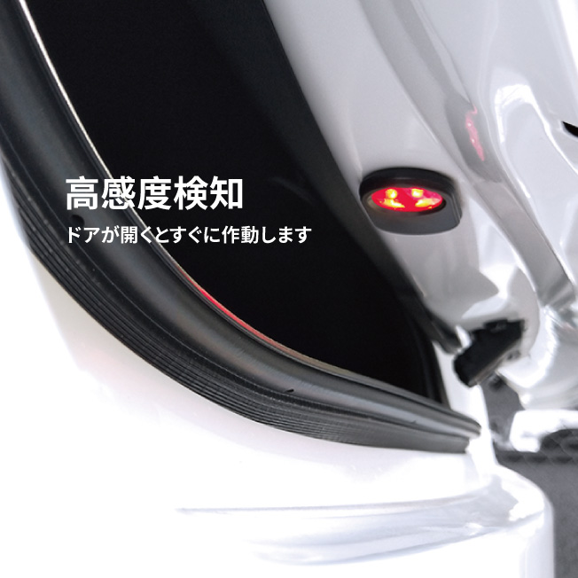 - 高感度の検知で、ドアが開くとすぐに作動します